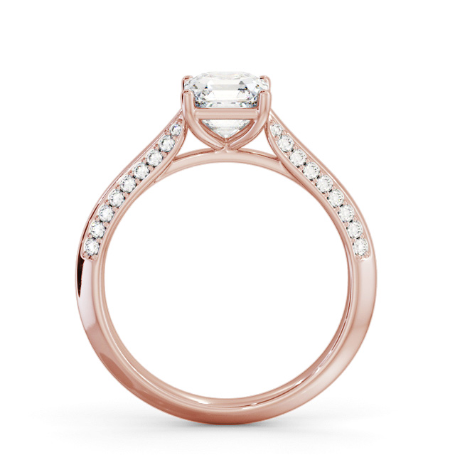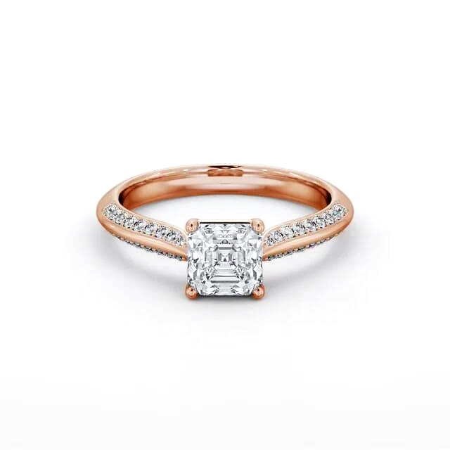 Bianca diamond engagement ring with a four claw 18K Rose Gold setting. Elegantly designed, this ring flaunts an asscher shaped centre diamond in a four claw setting and small round diamonds encased lustrous knife edge style band. Total diamond side stones weigh approximately 0.28ct with Clarity VS1 and Colour F. This ring is available in a range of metal options and your choice of natural or lab grown diamonds. We offer a free design service for any customised changes that you may require.