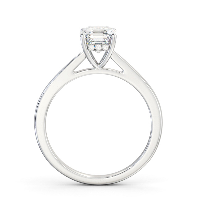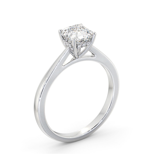 Tanvi diamond engagement ring with a four claw 18K White Gold setting. Elegantly enduring, this solitaire engagement ring presents an asscher shaped centre diamond set over a brightly polished band and a row of small round diamonds below the centre. This ring is available in a range of metal options and your choice of natural or lab grown diamonds. We offer a free design service for any customised changes that you may require.