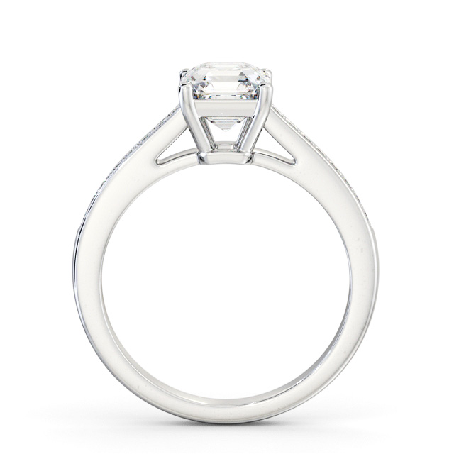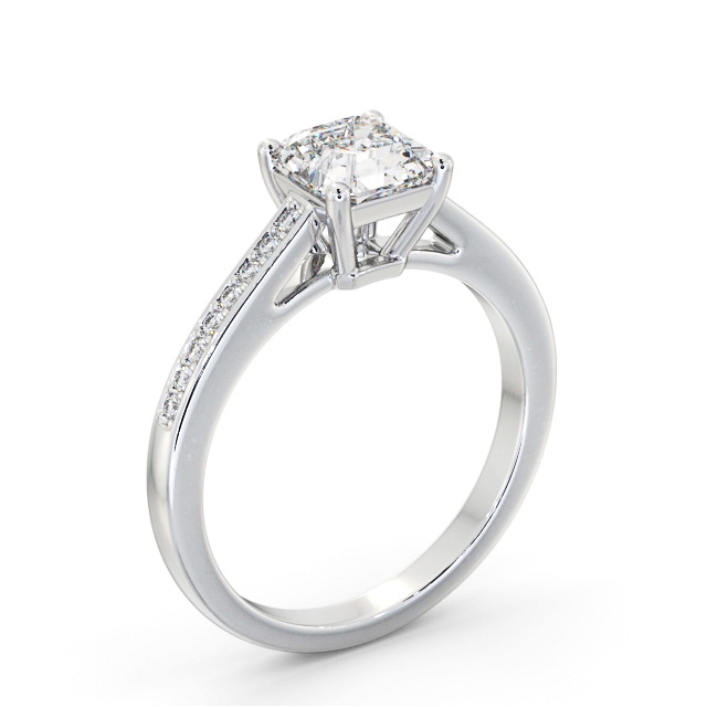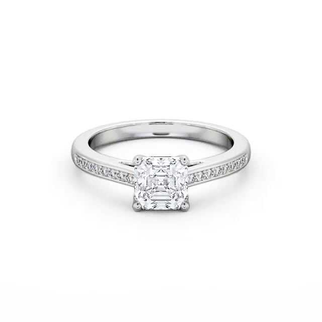 Loren diamond engagement ring with a four claw 18K White Gold setting. Bright and glamourous, this exceptional ring exposes a wonderful asscher shaped diamond at the top of polished slender band accented with small round diamonds. Total diamond side stones weigh approximately 0.10ct with Clarity VS1 and Colour F. This ring is available in a range of metal options and your choice of natural or lab grown diamonds. We offer a free design service for any customised changes that you may require.