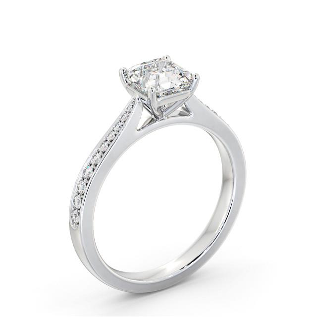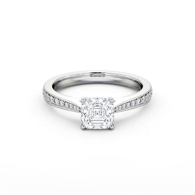 Laina diamond engagement ring with a four claw 9K White Gold setting. This glamourous engagement ring showcases an asscher shaped diamond in the centre protected with a four prong setting, while small round diamonds flow down on either side of the shoulders. Total diamond side stones weigh approximately 0.18ct with Clarity VS1 and Colour F. This ring is available in a range of metal options and your choice of natural or lab grown diamonds. We offer a free design service for any customised changes that you may require.