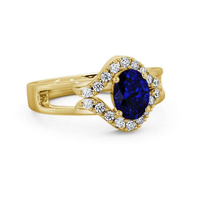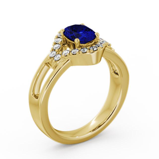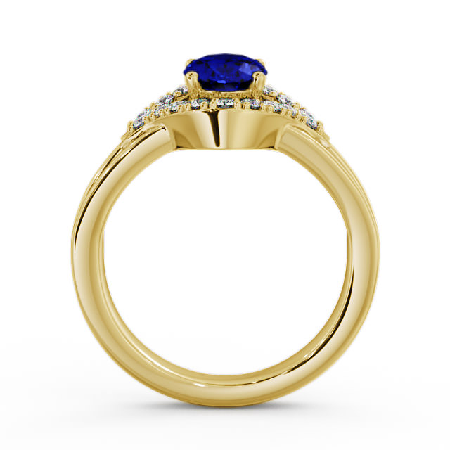 Lilibeth blue sapphire and diamond 1.18ct ring in a 9K Yellow Gold setting. Defined by modern elegance, this beautiful oval shaped blue sapphire gemstone ring is augmented by a halo of sparkling round diamonds. Sapphire weighs 1.00 Carat and diamonds are of 0.18 Carat total weight. This ring is available in a range of metal options with AAA grade gemstone. We offer a free design service for any customised changes that you may require.
