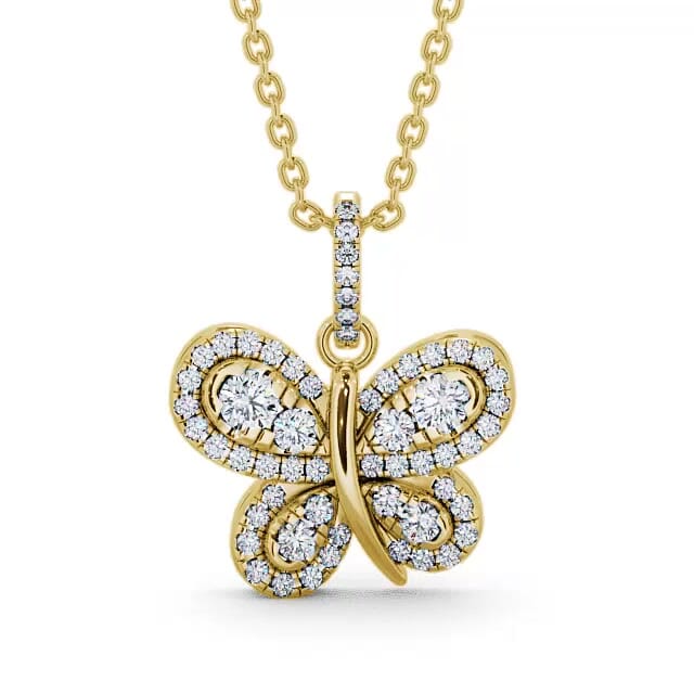 Winifred butterfly shaped diamond 0.55 Carat pendant in 9K Yellow Gold. Perfectly stunning, this pendant showcases beautiful butterfly design encrusted with dazzling round diamonds. This pendant is available in a range of metal and chain options with your choice of natural or lab grown diamonds. We offer a free design service for any customised changes that you may require.