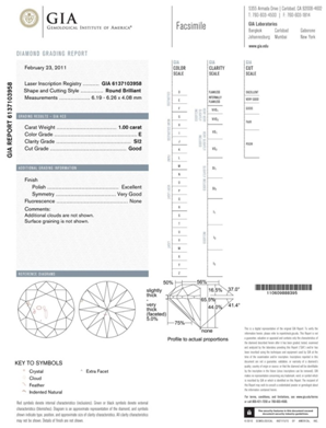 The certificate lists a number of characteristics about the diamond. This includes dimensions of the diamond, Carat Weight, Clarity, Colour etc.