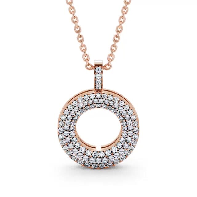 Angie circle shaped cluster diamond 0.60 Carat pendant in 9K Rose Gold. This gorgeous open circle pendant is ornate with three rows of dazzling round diamonds. Extra diamonds are placed on bail. This pendant is available in a range of metal and chain options with your choice of natural or lab grown diamonds. We offer a free design service for any customised changes that you may require.