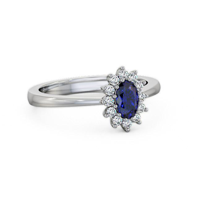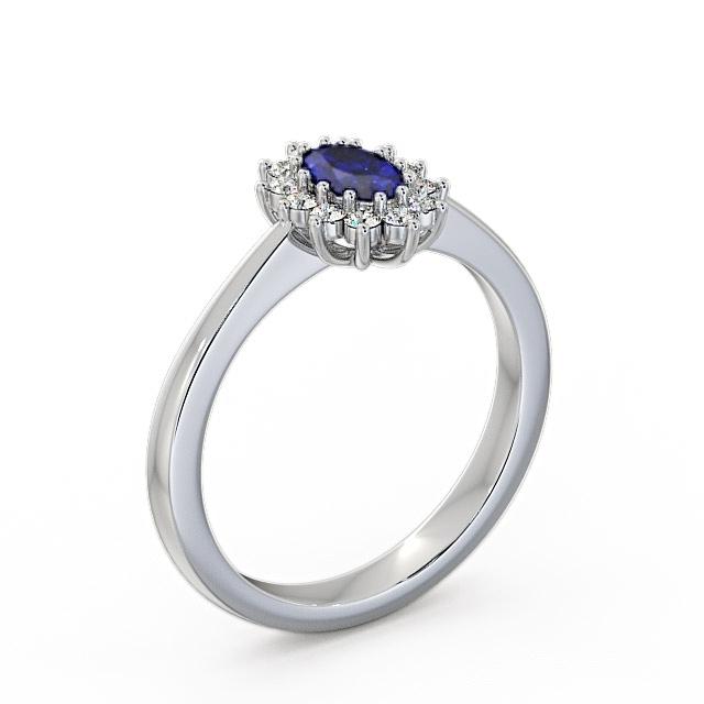 Kelsey cluster blue sapphire and diamond 0.52ct ring in a Palladium setting. This exquisite ring depicts a centre oval shaped blue sapphire framed by a cluster of round diamonds in a traditional design. Sapphire weighs 0.40 Carat and total diamonds weighs 0.12 Carat. This ring is available in a range of metal options with AAA grade gemstone. We offer a free design service for any customised changes that you may require.
