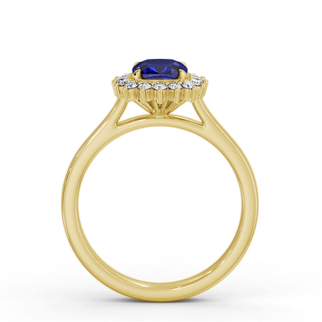Perla Cluster blue sapphire and diamond 0.90ct ring in 9K Yellow Gold. A single 0.75ct Cushion shaped blue sapphire is encircled by a cluster of small round shaped diamonds totaling 0.15ct in this classic and exquisite design ring. This ring is available in a variety of metal types and your choice of natural or lab grown gems. We provide a free design service for any special modifications that you may require.