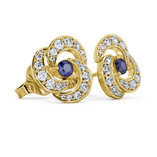 Melony cluster blue sapphire and diamond 1.19ct earrings in a 9K Yellow Gold setting. Skilfully crafted, these stud earrings feature 0.40 Carat round blue sapphire gemstones at the centre, artfully wrapped in alluring swirls of round diamonds totalling to 0.79 Carat. The total Carat weight is based on per pair. These earrings are available in a range of metal options with AAA grade gemstone. We offer a free design service for any customised changes that you may require.