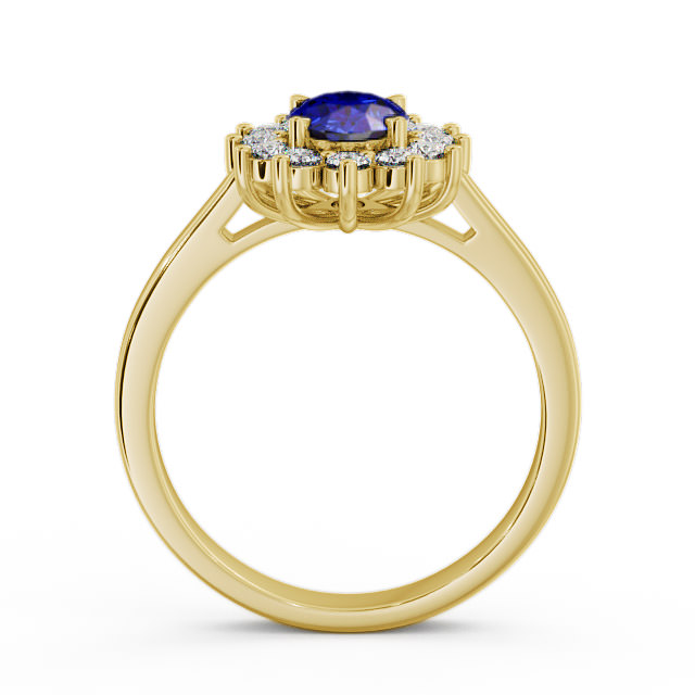 Jemima Cluster blue sapphire and diamond 1.42ct ring in a 9K Yellow Gold setting. An elegant ring accentuated by a 1.00 Carat oval shaped blue sapphire in the centre, beautifully framed by 0.42 Carat total weight of round diamonds. This ring is available in a range of metal options with AAA grade gemstone. We offer a free design service for any customised changes that you may require.