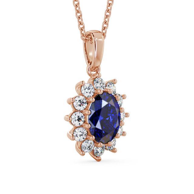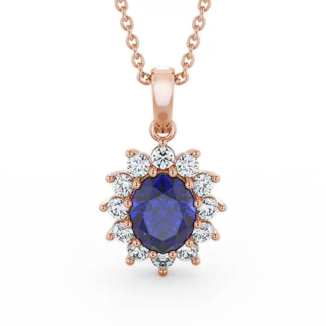 Briella cluster blue sapphire and diamond 2.03ct pendant in a 9K Rose Gold setting. Exquisitely elegant, this pendant showcases a 1.55 Carat blue oval sapphire peacefully resting at the centre of a stunning halo of 0.48 Carat round diamonds. The pendant is available in a range of metal and chain options with AAA grade gemstones. We offer a free design service for any customised changes that you may require.