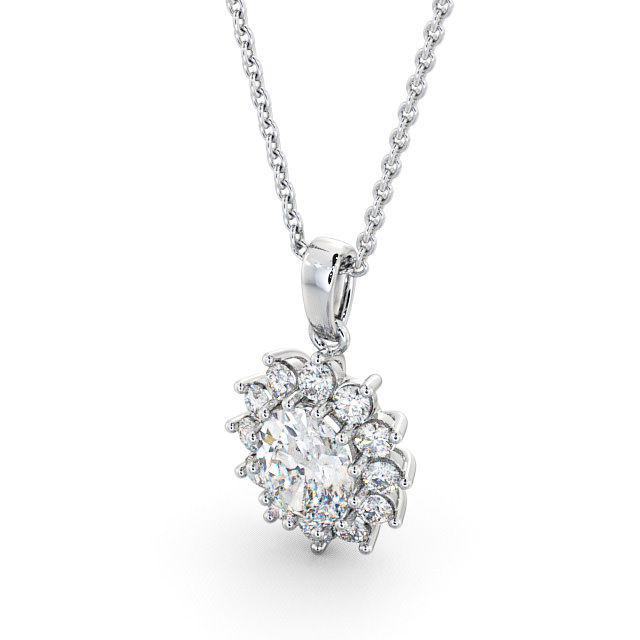 Jamaria cluster diamond pendant in 18K White Gold. Delicate in design, this luminous pendant showcases a large oval shaped diamond at the centre of a stunning halo of round diamonds. Smaller round cluster diamonds will be of standard quality VS1 Clarity and F Colour. This pendant is available in a range of metal and chain options with your choice of natural or lab grown diamonds. We offer a free design service for any customised changes that you may require.