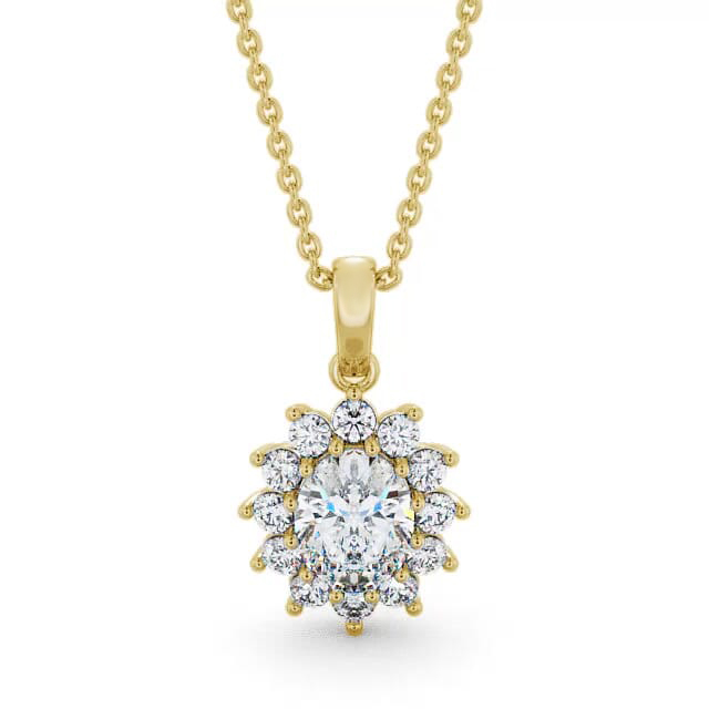Jamaria cluster diamond pendant in 9K Yellow Gold. Delicate in design, this luminous pendant showcases a large oval shaped diamond at the centre of a stunning halo of round diamonds. Smaller round cluster diamonds will be of standard quality VS1 Clarity and F Colour. This pendant is available in a range of metal and chain options with your choice of natural or lab grown diamonds. We offer a free design service for any customised changes that you may require.