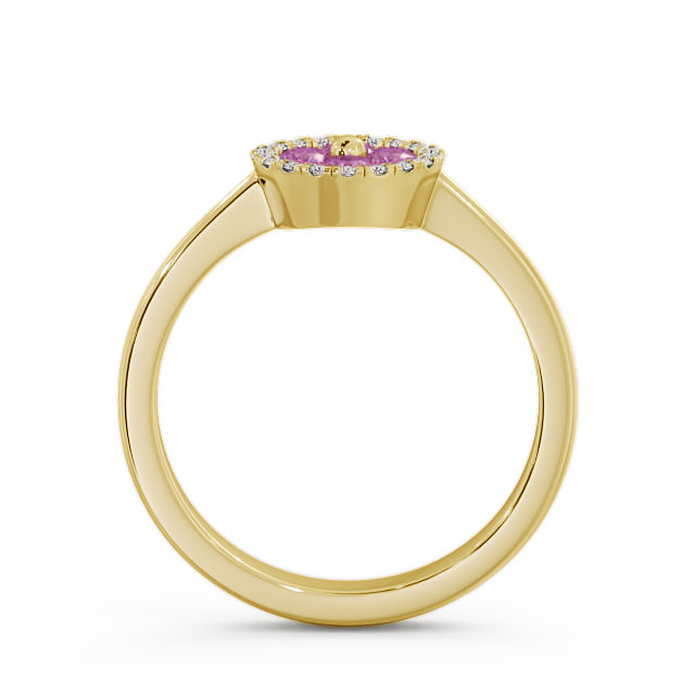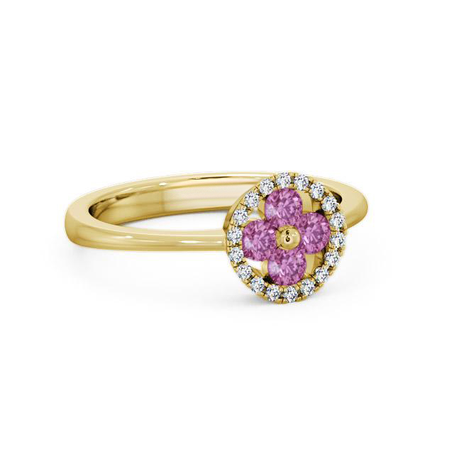 Annelise Cluster pink sapphire and diamond 0.43ct ring in a 9K Yellow Gold setting. Regal and radiant, this exquisite ring features a stunning arrangement of four beautiful round shaped pink sapphires in centre with a halo of round diamonds surrounding it. Total sapphires weighs 0.36 Carat and total diamonds weighs 0.07 Carat. This ring is available in a range of metal options with AAA grade gemstone. We offer a free design service for any customised changes that you may require.