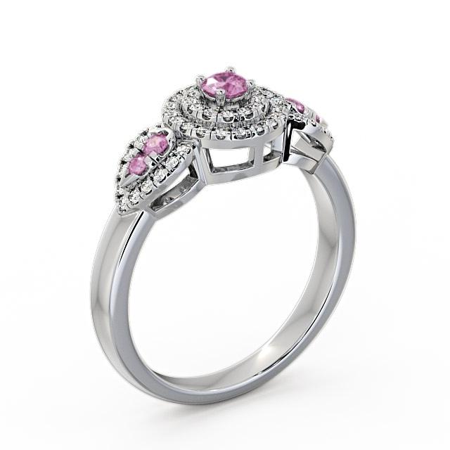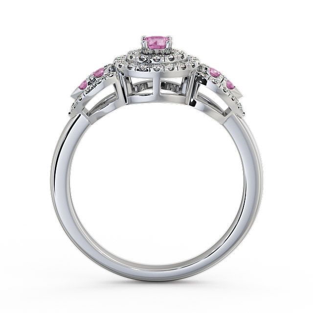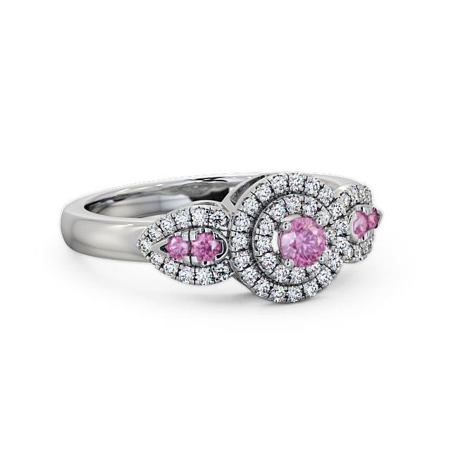 Tanisha cluster pink sapphire and diamond 0.50ct ring in a Palladium setting. Classy and attractive, this ring depicts a double halo of round diamonds in the centre flanked by pear shaped frames of round diamonds on each side, topped with beautiful round shaped pink sapphires. Total diamonds weighs 0.21 Carat and total pink sapphires weighs 0.29 Carat. This ring is available in a range of metal options with AAA grade gemstone. We offer a free design service for any customised changes that you may require.