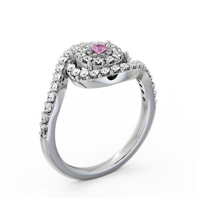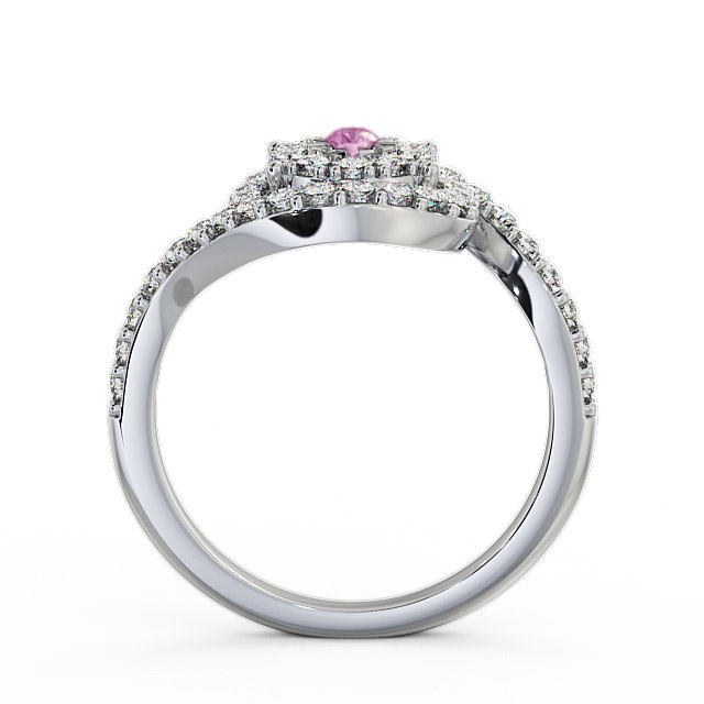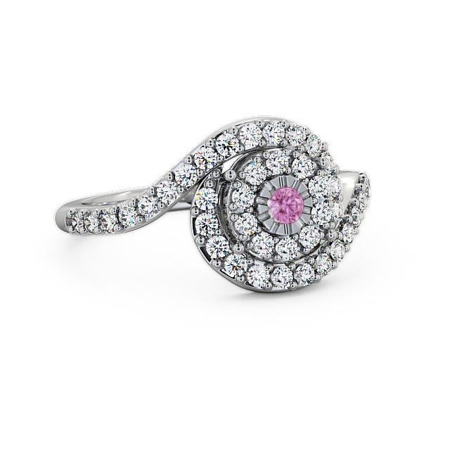 Selena Cluster pink sapphire and diamond 0.51ct ring in a 18K White Gold setting. Classically trendy, this ring features a round pink sapphire held in centre hugged by swirling loops of round diamonds that continue down each shoulder. Sapphire weighs 0.09 Carat and diamonds weighs 0.42 Carat in total. This ring is available in a range of metal options with AAA grade gemstone. We offer a free design service for any customised changes that you may require.