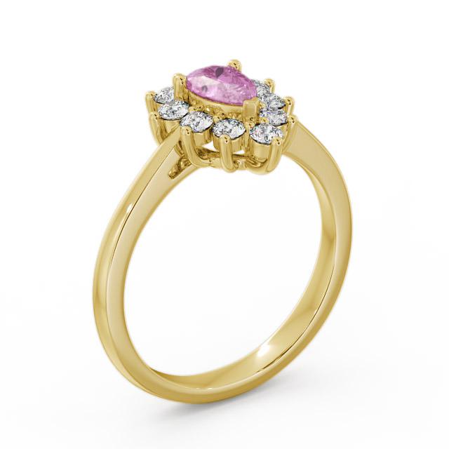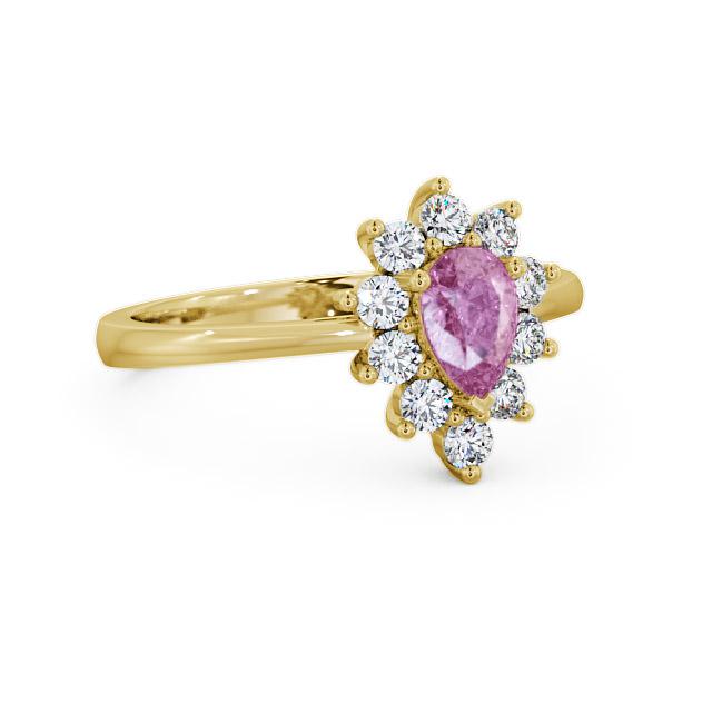 Kami Cluster pink sapphire and diamond 0.85ct ring in a 18K Yellow Gold setting. This unique and enchanting ring showcases a gorgeous 0.50 Carat pear shaped pink sapphire gemstone in the centre, flanked by sparkling round diamonds with a 0.35 Carat total weight set over a sleek polished finish band. This ring is available in a range of metal options with AAA grade gemstone. We offer a free design service for any customised changes that you may require.