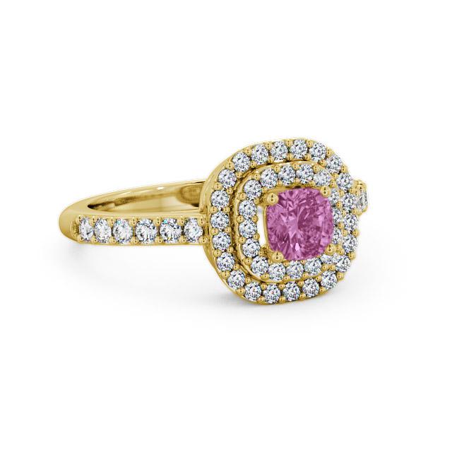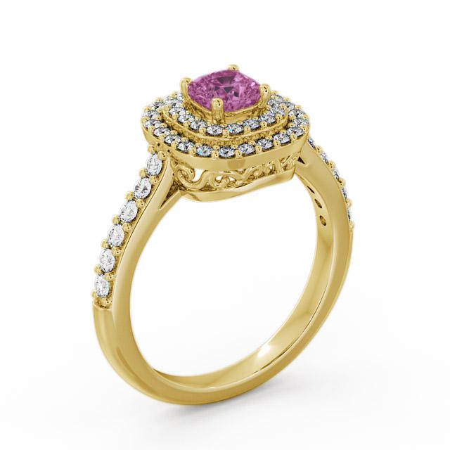 Kimber cluster pink sapphire and diamond 1.24ct ring in a 9K Yellow Gold setting. Dazzling with incredible sparkle, this ring features a beautiful 0.75 Carat cushion-cut pink sapphire wrapped by a double halo of round diamonds, Additional round diamonds flow down each shoulders. total diamonds weighs 0.49 Carat. This ring is available in a range of metal options with AAA grade gemstone. We offer a free design service for any customised changes that you may require.