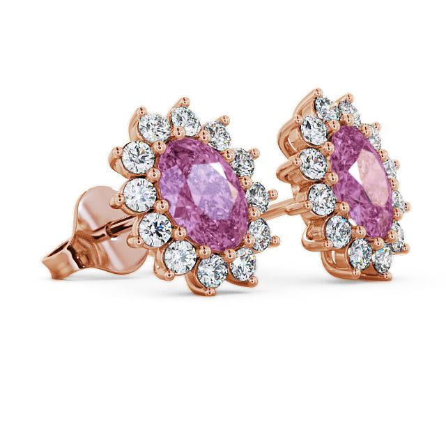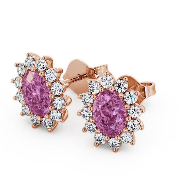 Neveah cluster pink sapphire and diamond 1.60ct earrings in a 18K Rose Gold setting. An exceptional pair of stud earrings, feature two oval shaped pink sapphires totalling to 1.20 Carat, resting inside 0.40 Carat total weight of round shaped diamonds in a perfect halo design. The total Carat weight is based on per pair. These earrings are available in a range of metal options with AAA grade gemstone. We offer a free design service for any customised changes that you may require.
