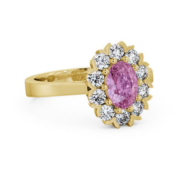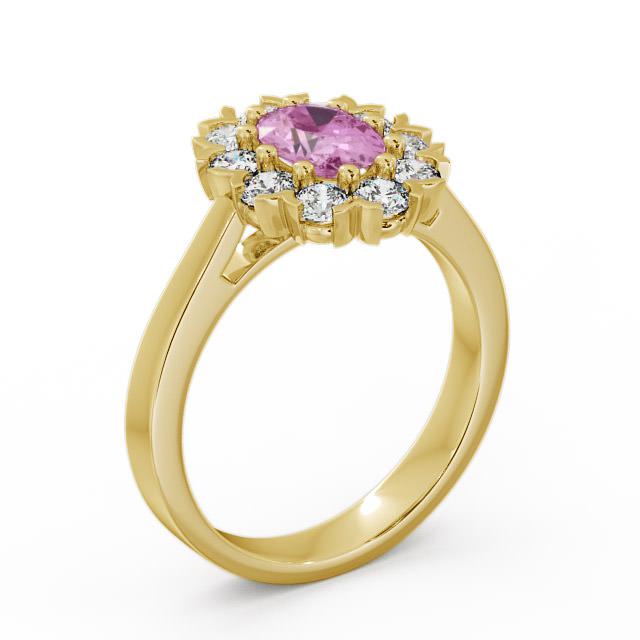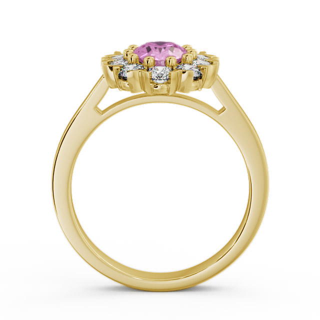 Greta Cluster pink sapphire and diamond 1.60ct ring in a 9K Yellow Gold setting. Truly divine, this ring features a 1.00 Carat oval shaped pink sapphire gemstone magically contrasting with a cluster of dazzling 0.60 Carat round diamonds. This ring is available in a range of metal options with AAA grade gemstone. We offer a free design service for any customised changes that you may require.