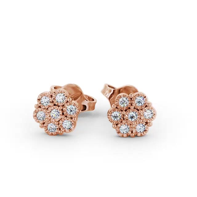 Kenslie cluster diamond earrings in 9K Rose Gold. Remarkably gorgeous, this pair of stud earrings exhibit a shimmering cluster of seven round diamonds in a special Illusion setting. The total diamond weight is based on per pair. These earrings are available in a range of metal options and your choice of natural or lab grown diamonds. We offer a free design service for any customised changes that you may require.