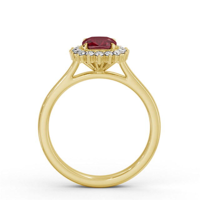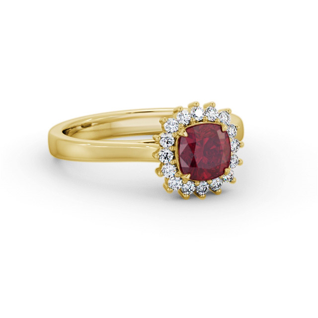 Perla Cluster ruby and diamond 0.90ct ring in 18K Yellow Gold. A single 0.75ct Cushion shaped ruby is encircled by a cluster of small round shaped diamonds totaling 0.15ct in this classic and exquisite design ring. This ring is available in a variety of metal types and your choice of natural or lab grown gems. We provide a free design service for any special modifications that you may require.