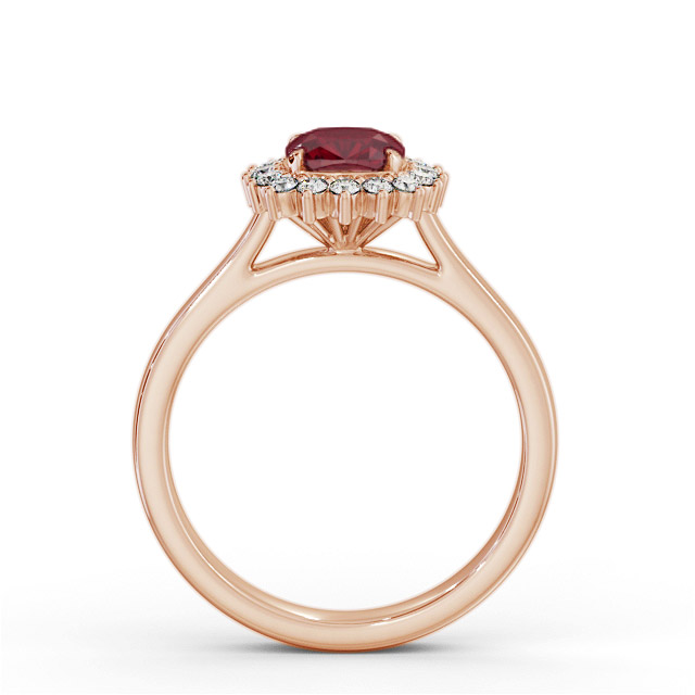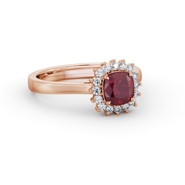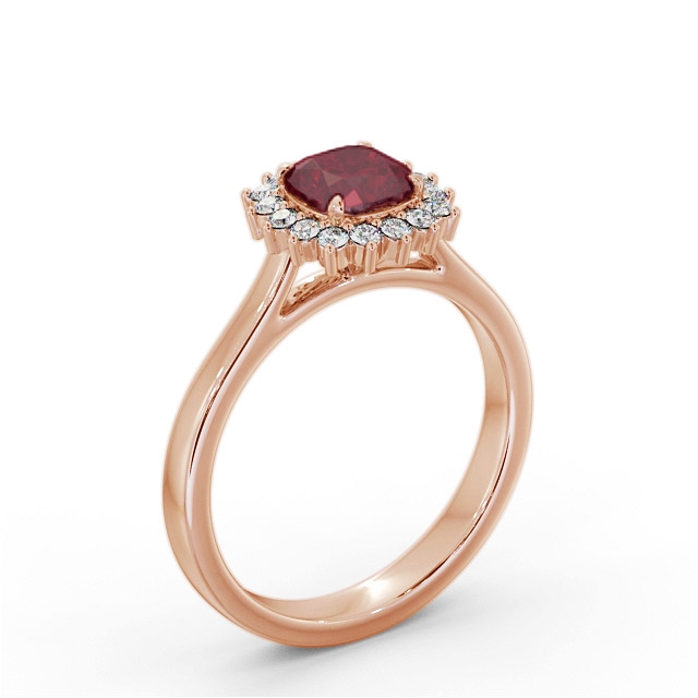 Perla Cluster ruby and diamond 0.90ct ring in 9K Rose Gold. A single 0.75ct Cushion shaped ruby is encircled by a cluster of small round shaped diamonds totaling 0.15ct in this classic and exquisite design ring. This ring is available in a variety of metal types and your choice of natural or lab grown gems. We provide a free design service for any special modifications that you may require.