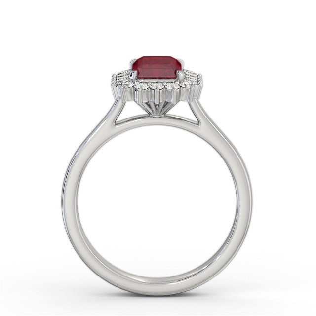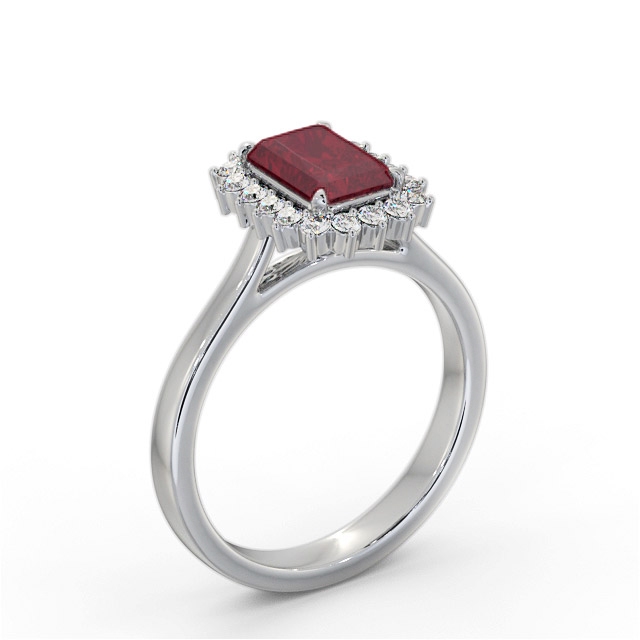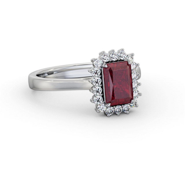 Jamina Cluster ruby and diamond 1.45ct ring in 18K White Gold. A single 1.15ct Emerald shaped ruby is encircled by a cluster of small round shaped diamonds totaling 0.30ct in this elegant and majestic design ring. This ring is available in a variety of metal types and your choice of natural or lab grown gems. We provide a free design service for any special modifications that you may require.
