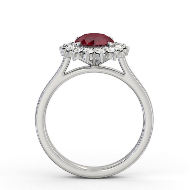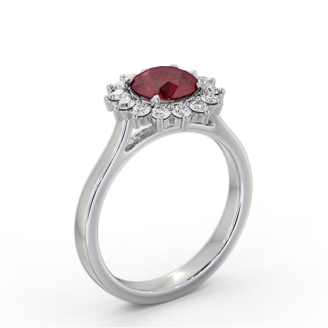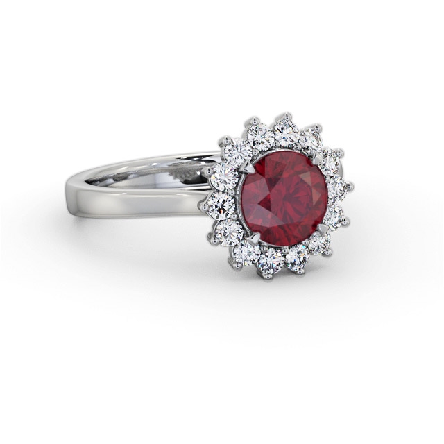 Jumana Cluster ruby and diamond 1.80ct ring in 18K White Gold. A solitary 1.40ct round shaped ruby is encircled by a cluster of small round shaped diamonds totaling 0.40ct in this regal and lovely design ring. This ring is available in a variety of metal types and your choice of natural or lab grown gems. We provide a free design service for any special modifications that you may require.
