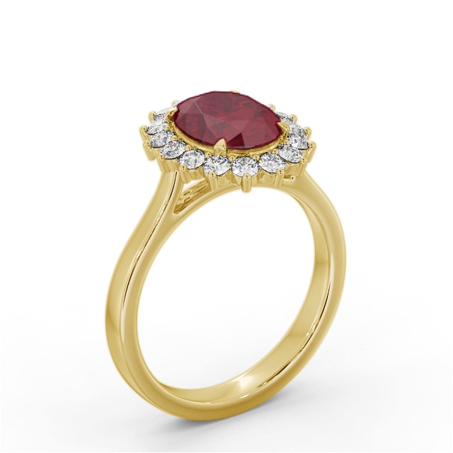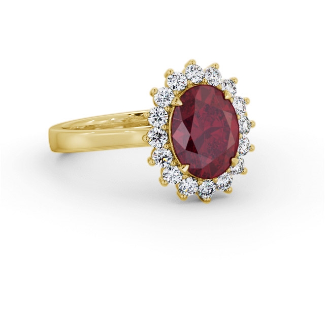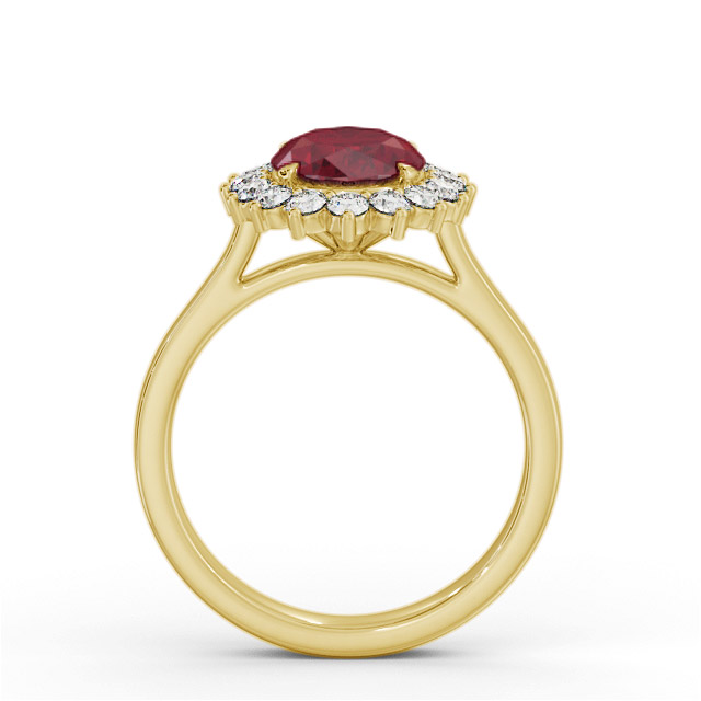 Lexen Cluster ruby and diamond 2.50ct ring in 9K Yellow Gold. Stunning and spectacular design ring with a single 2.00ct oval shaped ruby surrounded by a cluster of small round shaped diamonds totaling 0.50ct. This ring is available in a variety of metal types and your choice of natural or lab grown gems. We provide a free design service for any special modifications that you may require.