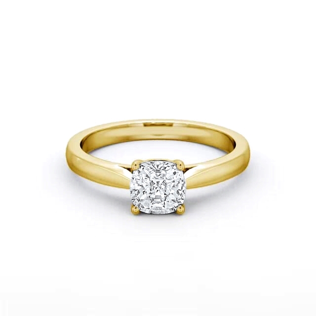 Lamya diamond engagement ring with a four claw 18K Yellow Gold setting. Classic in design, this engagement ring displays cushion shaped diamond solitaire secured by a four-prong setting. With a mid band width of 1.9mm, this ring is available in a range of metal options and your choice of natural or lab grown diamonds. We offer a free design service for any customised changes that you may require.