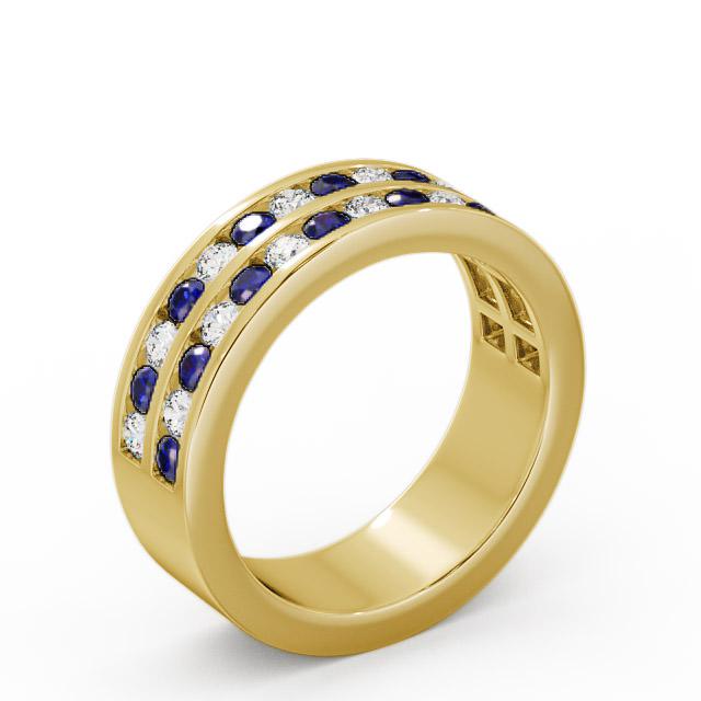 Breanna double row half eternity blue sapphire and diamond 1.20ct ring in a 9K Yellow Gold setting. This impressive half eternity ring features two dazzling rows of round blue sapphire gemstones with a 0.75 Carat total weight and round diamonds with a 0.45 Carat total weight in an alternating pattern. This ring is available in a range of metal options with AAA grade gemstone. We offer a free design service for any customised changes that you may require.