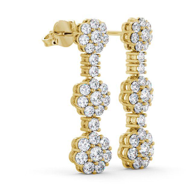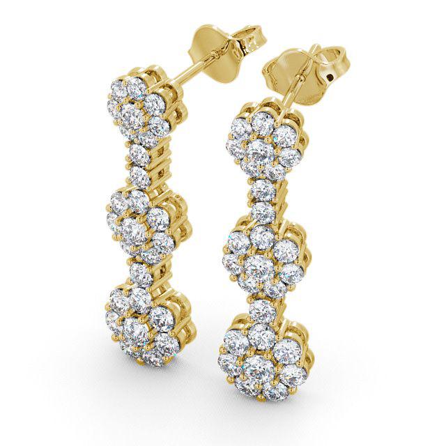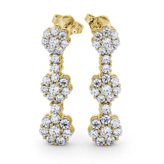 Cambrie diamond drop earrings in 9K Yellow Gold. these drop earrings showcase three flower-shaped clusters of shimmering round diamonds to exude maximum sparkle. The total diamond weight is based on per pair. These earrings are available in a range of metal options and your choice of natural or lab grown diamonds. We offer a free design service for any customised changes that you may require.