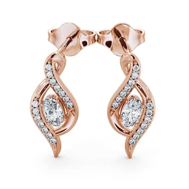 Kamara diamond 0.55 Carat drop earrings in 9K Rose Gold. Swirling with shimmer, these drop earrings feature a single oval shaped diamond artfully set in middle of diamond-lined twisted pattern. Smaller round diamonds will be of VS1 Clarity and F Colour as standard and total diamond weight is based on per pair. These earrings are available in a range of metal options and your choice of natural or lab grown diamonds. We offer a free design service for any customised changes that you may require.
