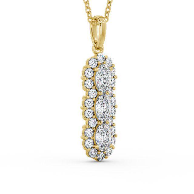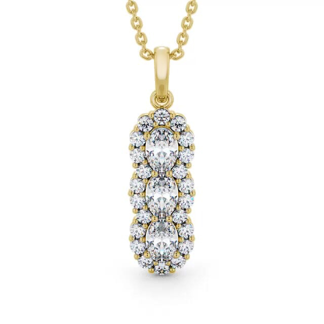 Niah drop diamond pendant in 18K Yellow Gold. This one-of-a-kind pendant features three oval-shaped diamonds adorned with a frame of smaller round diamonds. Smaller round diamonds will be of standard quality VS1 Clarity and F Colour. This pendant is available in a range of metal and chain options with your choice of natural or lab grown diamonds. We offer a free design service for any customised changes that you may require.