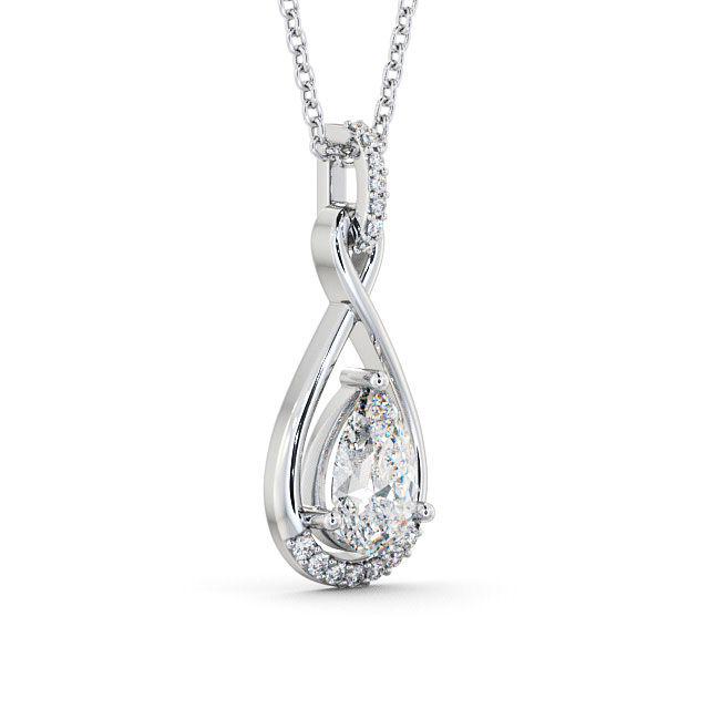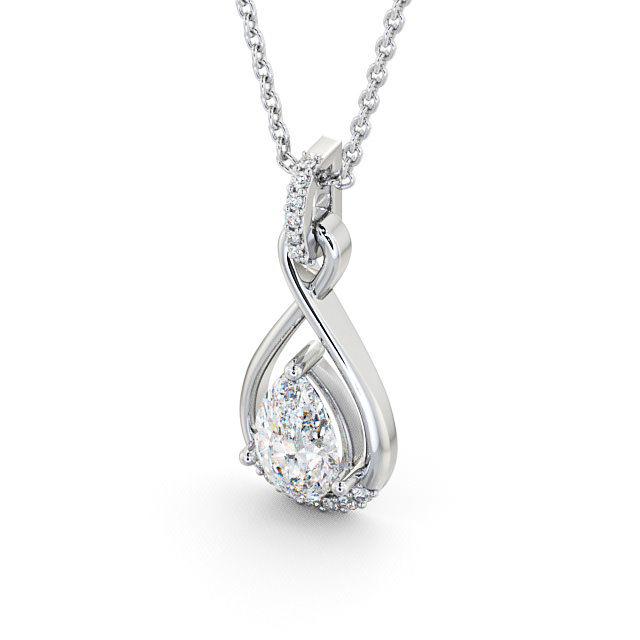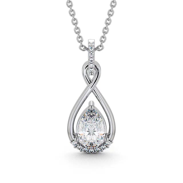 Kala drop diamond pendant in 9K White Gold. Sculpted into an infinity, this elegant pendant is adorned with shimmering round diamonds on the frame and a large pear shaped diamond inside the loop. Smaller round diamonds will be of standard quality VS1 Clarity and F Colour. This pendant is available in a range of metal and chain options with your choice of natural or lab grown diamonds. We offer a free design service for any customised changes that you may require.