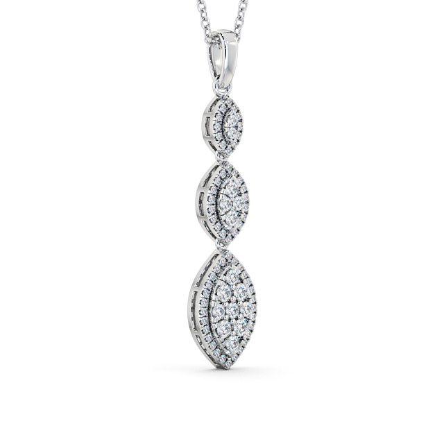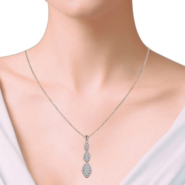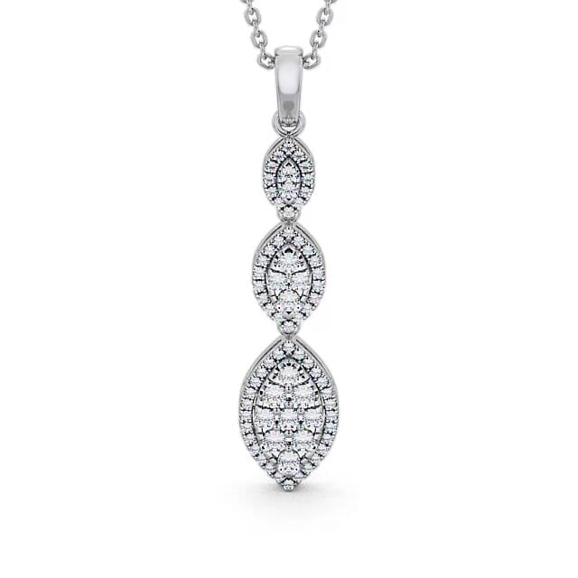 Zoriah drop diamond 0.65 Carat pendant in 18K White Gold. This delightful pendant features a trio of graduated marquise shapes, each adorned with a cluster of sparkling round diamonds. This pendant is available in a range of metal and chain options with your choice of natural or lab grown diamonds. We offer a free design service for any customised changes that you may require.