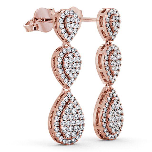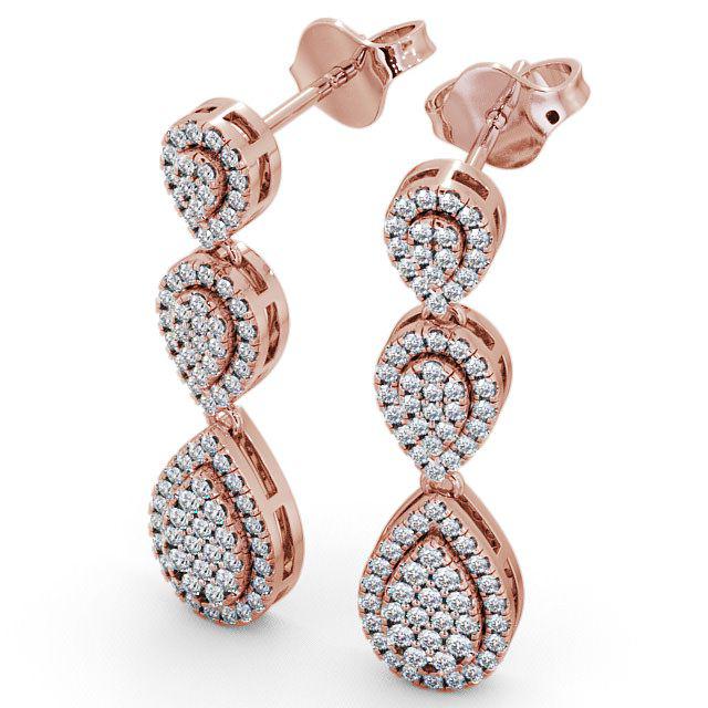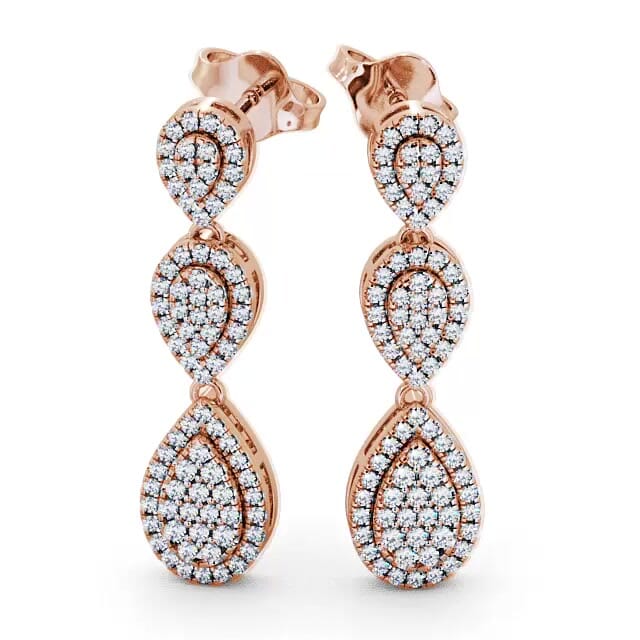 Dalary round diamond 0.70 Carat drop earrings in 18K Rose Gold. Astonishingly delightful, this dangling pair of drop earrings showcases three graduated pear-shaped clusters of shimmering round diamonds. The total diamond weight is based on per pair. These earrings are available in a range of metal options and your choice of natural or lab grown diamonds. We offer a free design service for any customised changes that you may require.