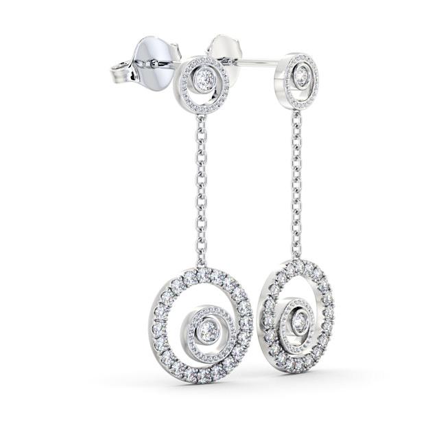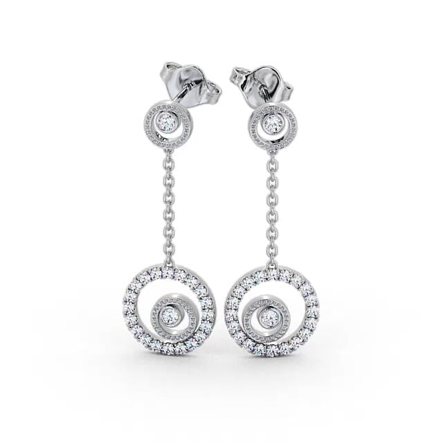 Esther drop diamond earrings in 18K White Gold. Simply sophisticated, these drop earrings showcase glistening round diamonds adorned circles connected with chain. The total diamond weight is based on per pair. These earrings are available in a range of metal options and your choice of natural or lab grown diamonds. We offer a free design service for any customised changes that you may require.