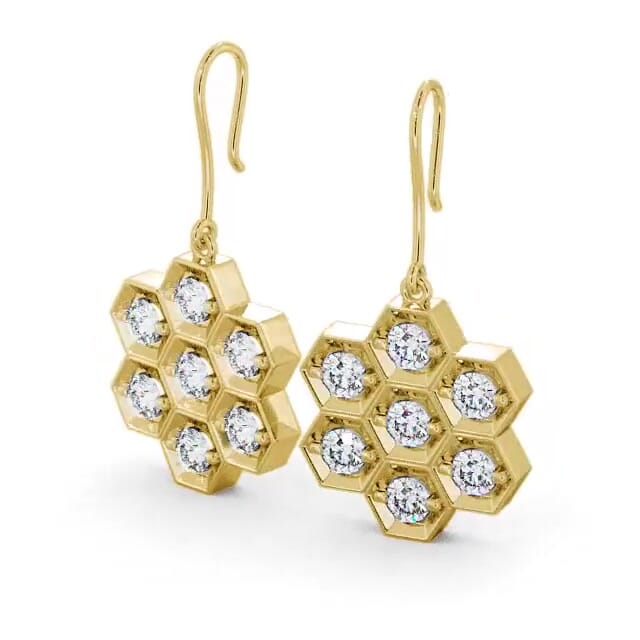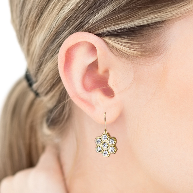 Macey diamond drop earrings in 9K White Gold. Unique and versatile, these dangle earrings features an elegant honeycomb design, each adorned with seven round shaped diamonds. The total diamond weight is based on per pair. These earrings are available in a range of metal options and your choice of natural or lab grown diamonds. We offer a free design service for any customised changes that you may require.