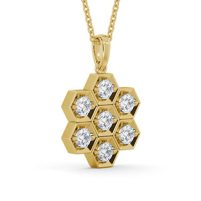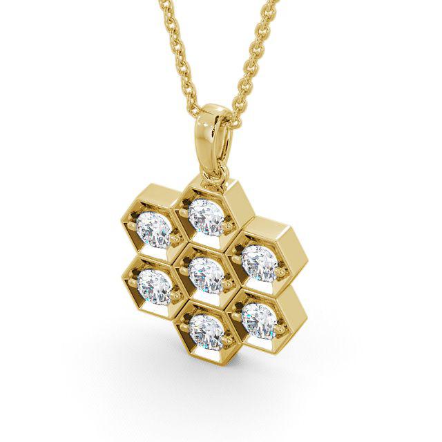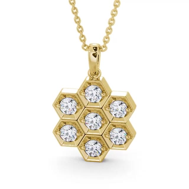 Aluna drop diamond pendant in 9K Yellow Gold. Unique and stylish, this honeycomb design pendant is graced with seven dazzling round shaped diamonds. This pendant is available in a range of metal and chain options with your choice of natural or lab grown diamonds. We offer a free design service for any customised changes that you may require.