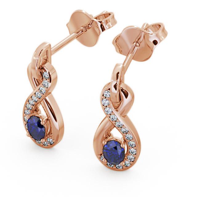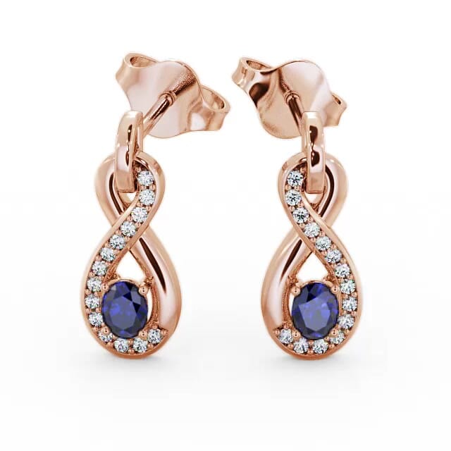 Maren drop style blue sapphire and diamond 0.81ct earrings in a 18K Rose Gold setting. Exuding timeless elegance, these delicate drop earrings feature two oval shaped blue sapphire gemstones with a 0.60 Carat total weight, set inside 0.11 Carat total weight round diamond-lined alluring infinity design. The total Carat weight is based on per pair. These earrings are available in a range of metal options with AAA grade gemstone. We offer a free design service for any customised changes that you may require.