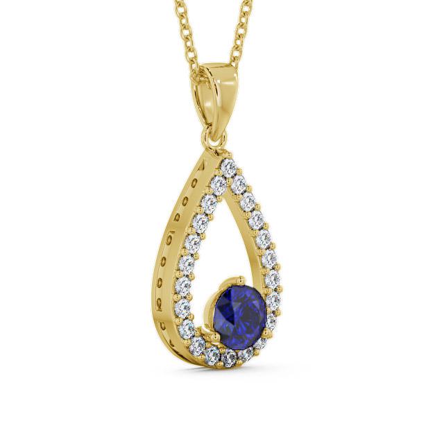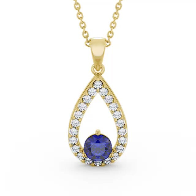 Kansas drop style blue sapphire and diamond 1.49ct pendant in a 18K Yellow Gold setting. With entrancing style, this sensational pendant features a 1.05 Carat round-shaped blue sapphire at the base of a shimmering 0.44 Carat diamond-lined halo teardrop design. The pendant is available in a range of metal and chain options with AAA grade gemstones. We offer a free design service for any customised changes that you may require.