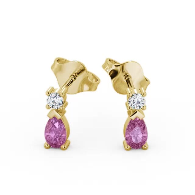 Amory drop style pink sapphire and diamond 0.72ct earrings in a 9K Yellow Gold setting. Each drop style earrings showcases a pear-shaped pink sapphire iced with a round diamond. Total gemstones and diamonds weighs 0.60 Carat and 0.12 Carat respectively. The total Carat weight is based on per pair. These earrings are available in a range of metal options with AAA grade gemstone. We offer a free design service for any customised changes that you may require.