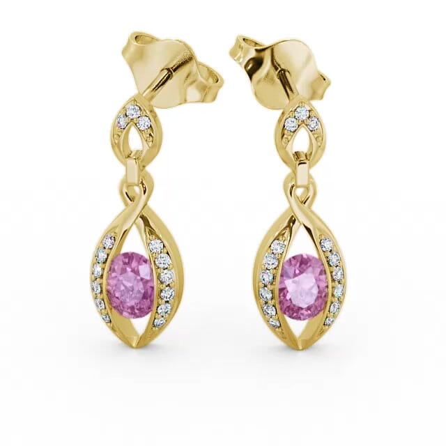 Jaleesa drop style pink sapphire and diamond 1.32ct earrings in a 9K Yellow Gold setting. Embodying sublime elegance, these marquise design dangle earrings exhibit 1.20 Carat total weight oval shaped pink sapphire gemstones and glistening 0.12 Carat total weight of round diamonds. The total Carat weight is based on per pair. These earrings are available in a range of metal options with AAA grade gemstone. We offer a free design service for any customised changes that you may require.