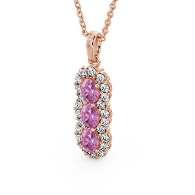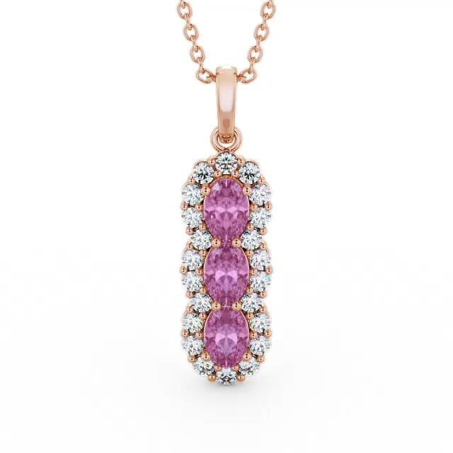 Jaquelin drop style pink sapphire and diamond 2.46ct pendant in a 9K Rose Gold setting. Sophisticated and elegant, this three stone pendant features trio of 1.80 Carat total weight oval-shaped pink sapphire gemstones, adorned with a frame of 0.66 Carat total weight of round diamonds. The pendant is available in a range of metal and chain options with AAA grade gemstones. We offer a free design service for any customised changes that you may require.