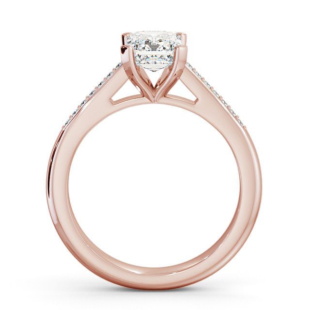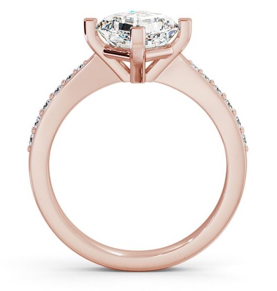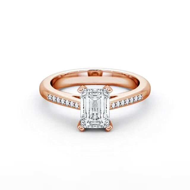 Leyla diamond engagement ring with a four claw 18K Rose Gold setting. Featuring a gorgeous emerald shaped centre diamond, this unique engagement ring is adorned with round diamonds encapsulating the slightly tapered shank. The diamond side stones are an approximate total of 0.08ct with Clarity VS1 and Colour F. This ring is available in a range of metal options and your choice of natural or lab grown diamonds. We offer a free design service for any customised changes that you may require.