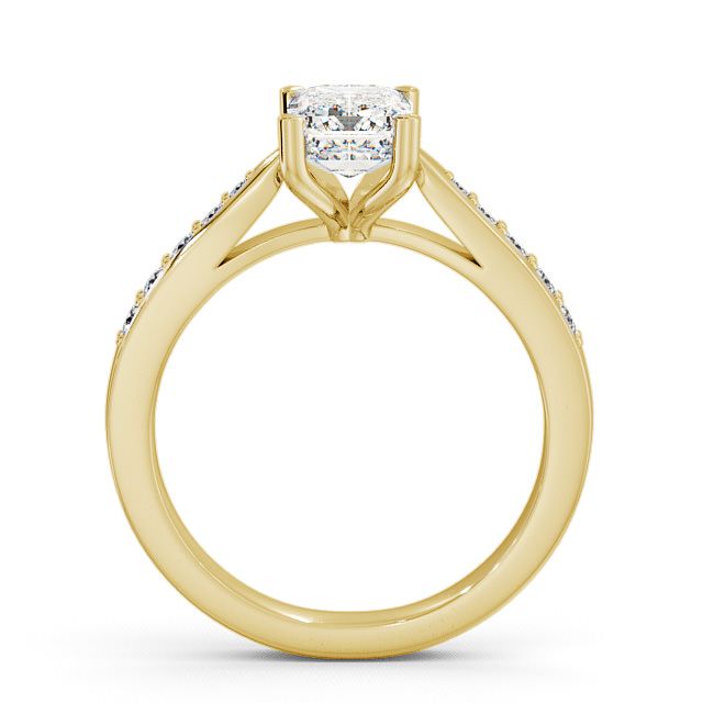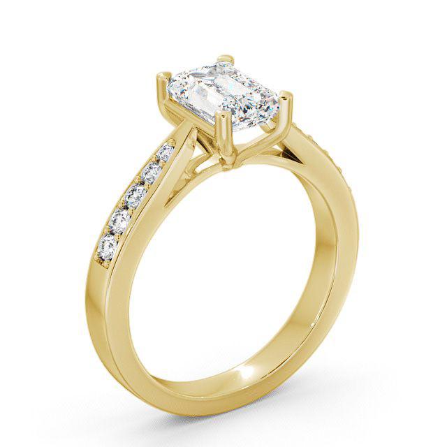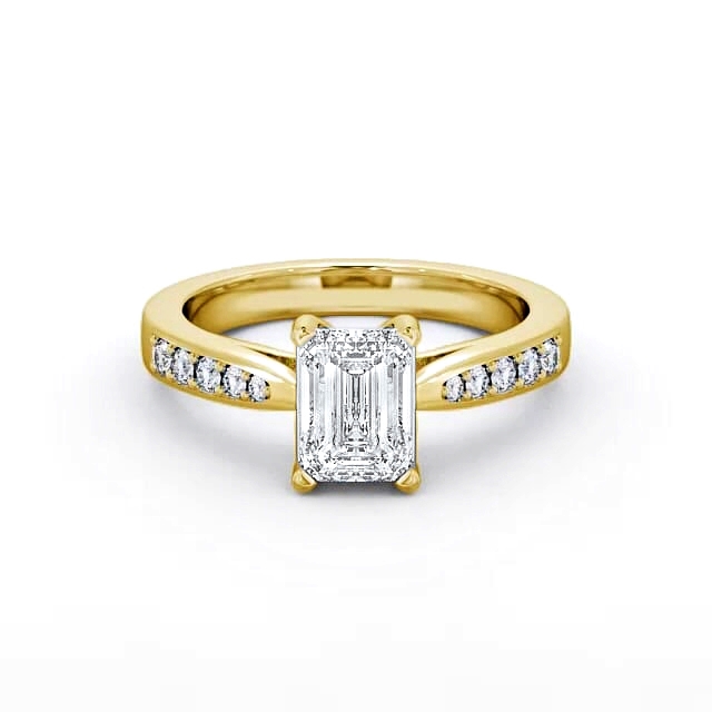Arin diamond engagement ring with a four claw 18K Yellow Gold setting. With elegance and sophistication, this engagement ring features a beautiful prong set emerald cut diamond peacefully sitting above round diamonds studded tapered shoulders. The diamond side stones are an approximate total of 0.16ct with Clarity VS1 and Colour F. This ring is available in a range of metal options and your choice of natural or lab grown diamonds. We offer a free design service for any customised changes that you may require.