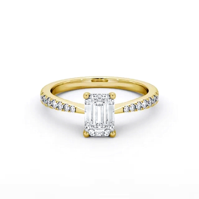 Renata diamond engagement ring with a four claw 18K Yellow Gold setting. This beautiful engagement ring radiates with a four-prong set emerald shaped diamond at the centre and round diamond accented shoulders. Total diamond side stones weigh approximately 0.15ct with Clarity VS1 and Colour F. This ring is available in a range of metal options and your choice of natural or lab grown diamonds. We offer a free design service for any customised changes that you may require.