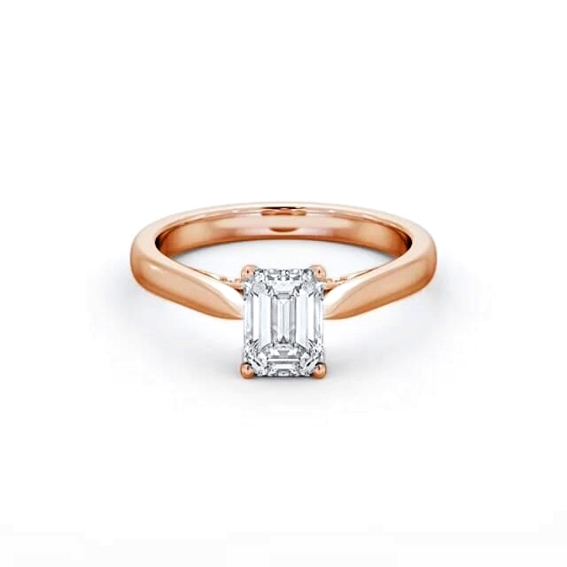 Wandel diamond engagement ring with a four claw 9K Rose Gold setting. With refined elegance this ring showcases a sparkling emerald shaped diamond standing tall in a four prong setting, and additional round diamonds line the ring's bridge. This ring is available in a range of metal options and your choice of natural or lab grown diamonds. We offer a free design service for any customised changes that you may require.