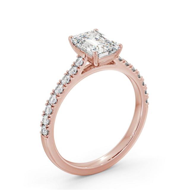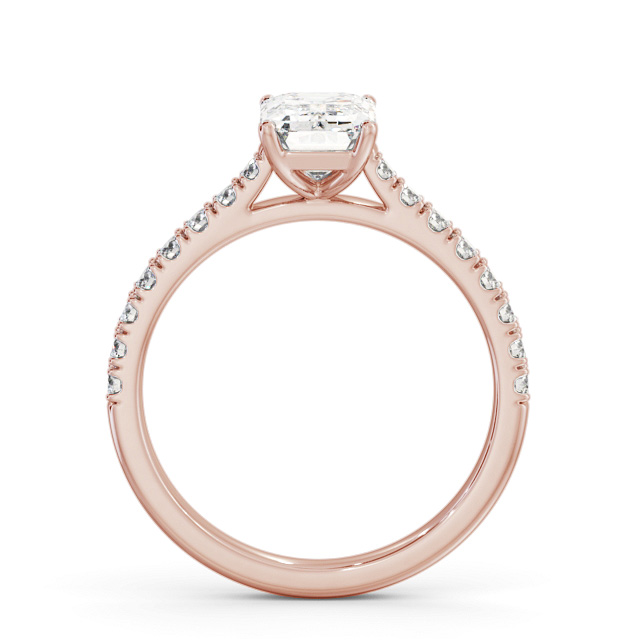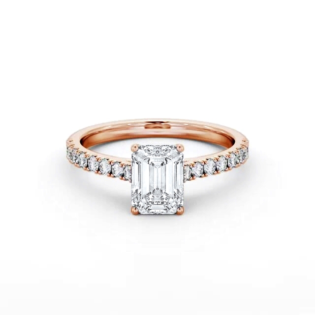 Alany diamond engagement ring with a four claw 9K Rose Gold setting. A single emerald shaped diamond is placed in a four prong setting at the centre of this engagement ring, and small round diamonds flow down on either side of the band. Total diamond side stones weigh approximately 0.25ct with Clarity VS1 and Colour F. This ring is available in a range of metal options and your choice of natural or lab grown diamonds. We offer a free design service for any customised changes that you may require.