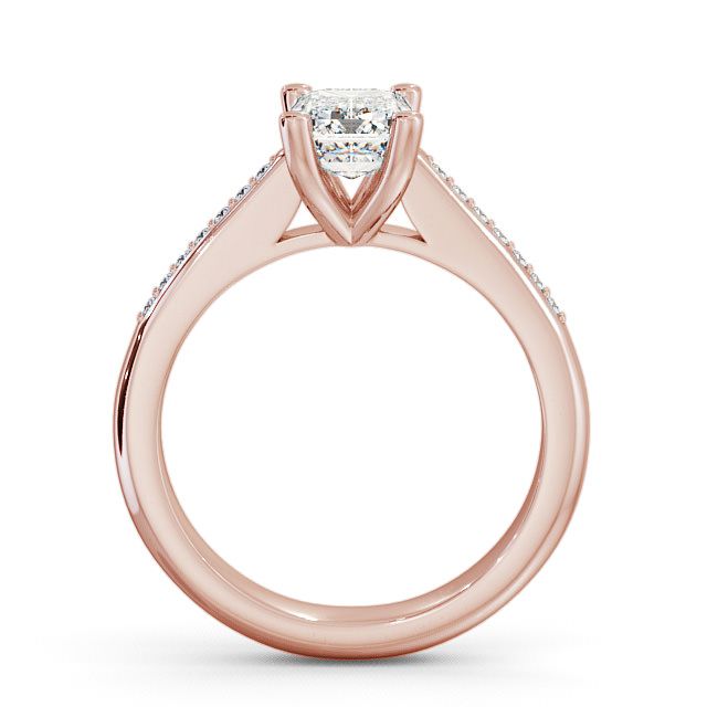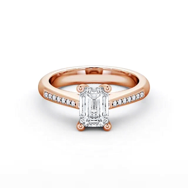 Chelsie diamond engagement ring with a four claw 9K Rose Gold setting. A magnificent engagement ring with an emerald shaped centre diamond adorned by a delicate round diamonds on both sides of the shoulder. The diamond side stones are an approximate total of 0.08ct with Clarity VS1 and Colour F. This ring is available in a range of metal options and your choice of natural or lab grown diamonds. We offer a free design service for any customised changes that you may require.